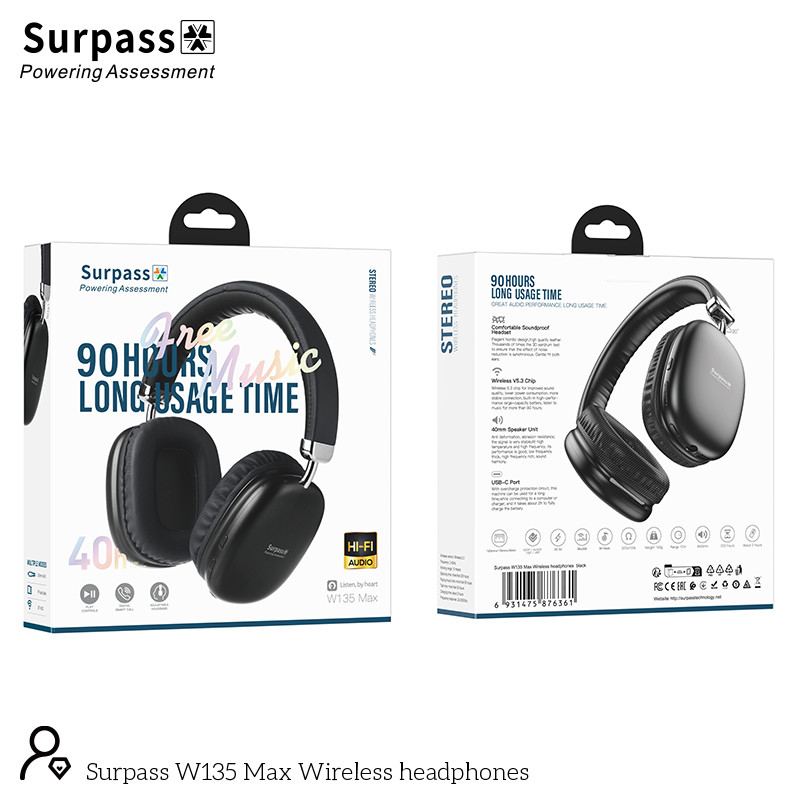 - The Surpass W135 Max Stereo HiFi Music Headphones offer an immersive audio experience with the latest Bluetooth 5.3 technology, ensuring seamless connectivity and superior sound quality. Transitioning into the modern era of wireless audio, these headphones provide users with a versatile and efficient solution for their music needs.